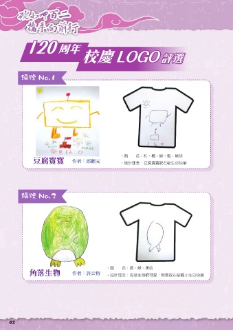 120 校慶 評選 120 周年 周年 LOGO 校慶 LOGO 評選 編號 No.1 •顏 色:紅、橘、綠、藍、咖啡 豆腐寶寶 作者:邱麒安 •設計理念:豆腐寶寶祝石碇生日快樂 編號 No.2 •顏 色:黃、綠、黑色 角落生物 作者:許云榕 •設計理念:角落生物很可愛,牠要祝石碇國小生日快樂 82