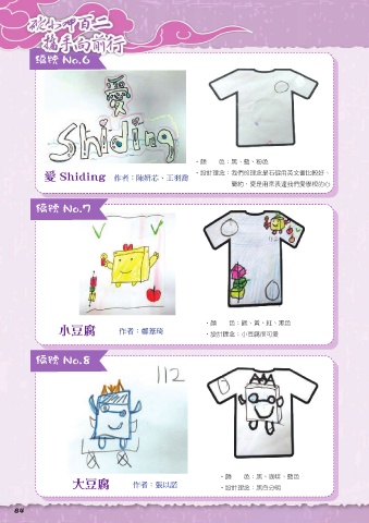 編號 No.6 •顏 色:黑、藍、粉色 愛 Shiding 作者:陳妍芯、王羽喬 •設計理念:我們的理念是石碇用英文會比較好、 簡約,愛是用來表達我們愛學校的心 編號 No.7 •顏 色:綠、黃、紅、黑色 小豆腐 作者:鄭葦琦 •設計理念:小豆腐很可愛 編號 No.8 •顏 色:黑、咖啡、藍色 大豆腐 作者:張以諾 •設計理念:黑白分明 84
