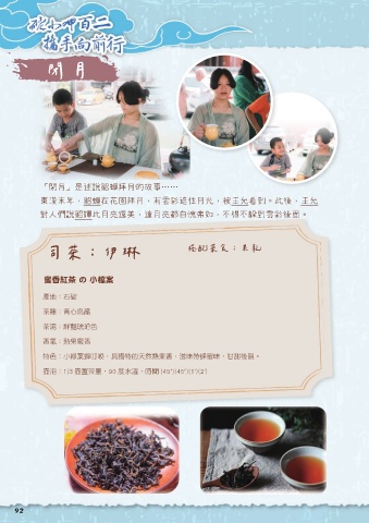 閉月 「閉月」是述說貂蟬拜月的故事…… 東漢末年,貂蟬在花園拜月,有雲彩遮住月光,被王允看到。此後,王允 對人們說貂嬋比月亮還美,連月亮都自愧弗如,不得不躲到雲彩後面。 司茶:伊琳 搭配茶食:果乾 蜜香紅茶 の 小檔案 產地:石碇 茶種:青心烏龍 茶湯:鮮豔琥珀色 香氣:熟果蜜香 特色:小綠葉蟬叮咬,具獨特的天然熟果香,滋味帶蜂蜜味,甘甜後韻。 壺泡:1/3 壺置茶量,90 度水溫,時間 (45")(45")(1')(2') 92